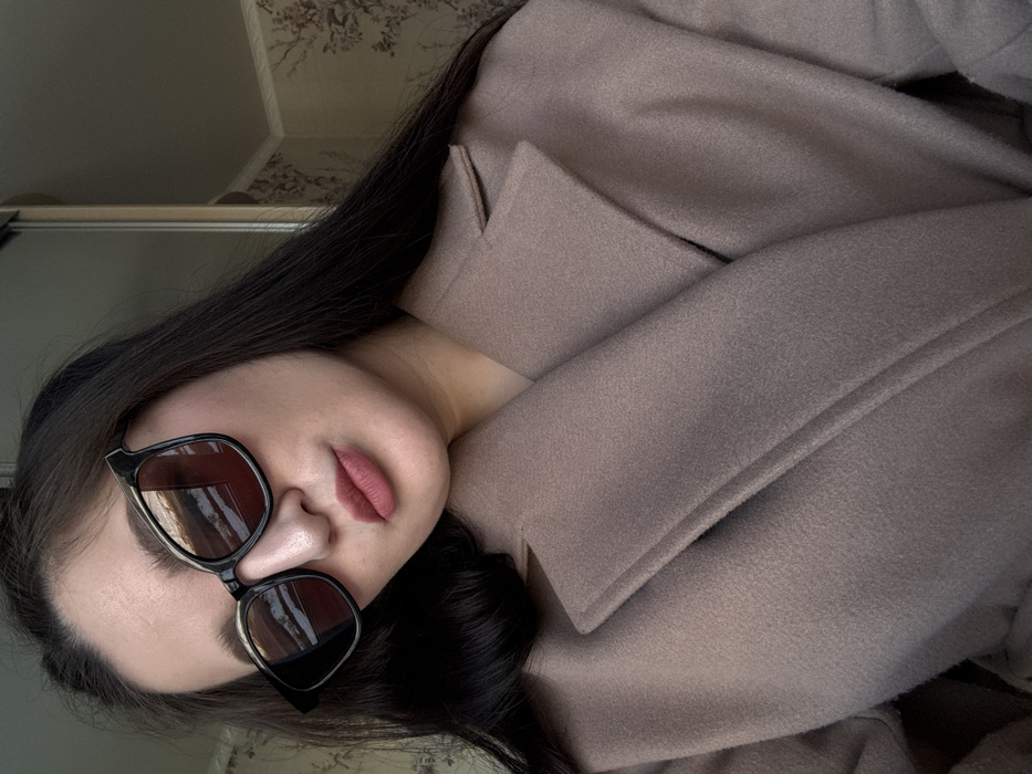 An adult female is depicted in a close-up, chest-up shot within an interior space, identified as being in the city of Kurovskoye, Russia. She wears dark-framed sunglasses, reflecting an indistinct outdoor scene with visible light and what appears to be a window frame. Her lips are adorned with reddish-pink lipstick. She has long, dark hair and is dressed in a light brown or beige textured coat featuring wide lapels. The background shows a wall with patterned floral wallpaper, displaying dark branches and blossoms against a light-toned base. A segment of a light-colored sliding wardrobe or closet is visible to the upper right.