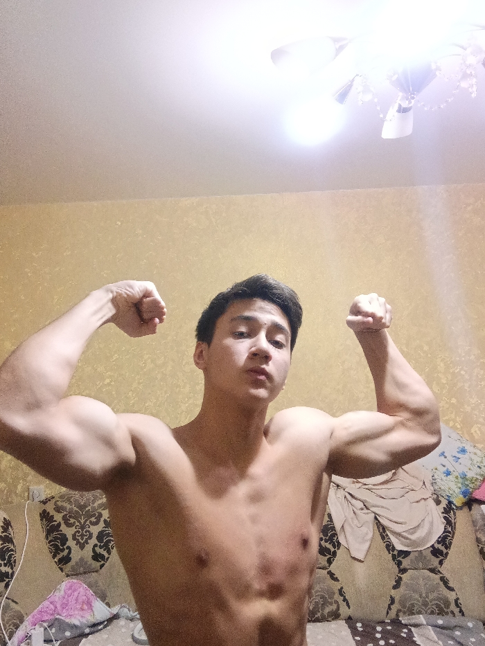 A young male, appearing to be of East Asian ethnicity, is depicted shirtless, flexing both biceps towards the camera, with a neutral expression
