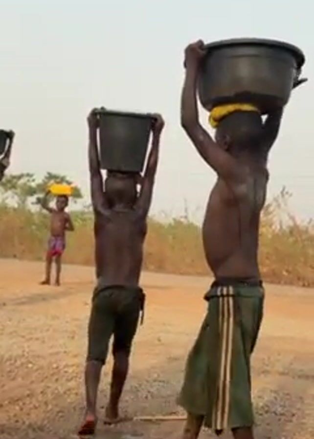 The video depicts several children carrying containers on their heads while walking along a dirt road. They appear to be walking uphill. The children are slender and their torsos are bare. The containers appear to be gray or black. The surrounding environment includes foliage and trees. The sky is a light hazy color.