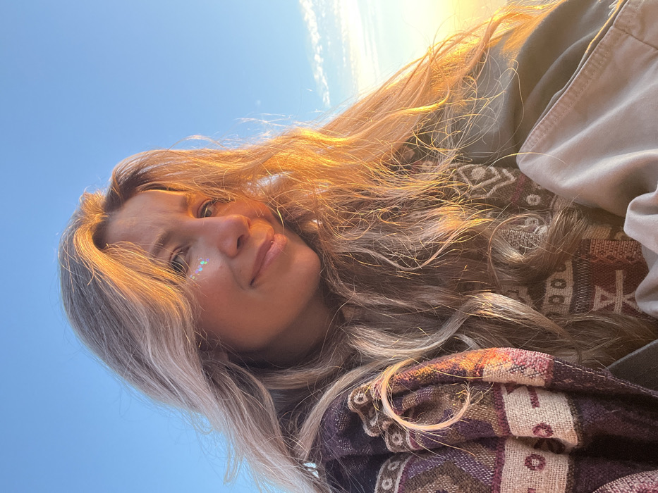 A selfie captures a young woman against a backdrop of a bright blue sky with wispy clouds. The sun casts a golden glow on her wavy blonde hair and skin, highlighting the iridescent glitter adorning her cheek. She wears a patterned scarf with earthy tones and a jacket with a neutral color. The low angle emphasizes the vastness of the sky.