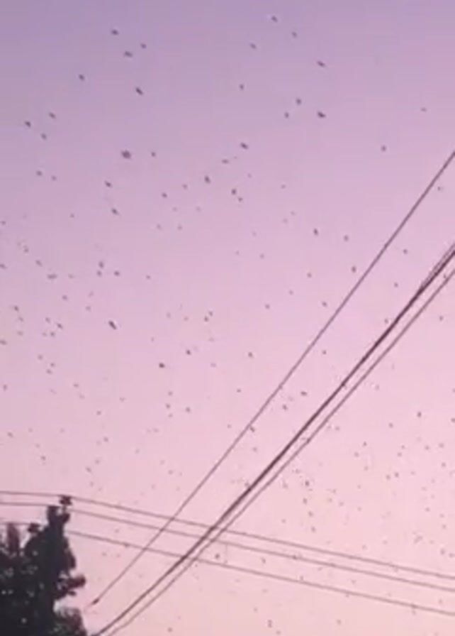 large flock of birds flying in the sky. The sky is a pale pink or lilac color, possibly indicating dawn or dusk. There are power lines running across the frame, and a tree is visible in the lower left corner. The camera appears to be pointed upwards to capture the birds in flight. The scene is relatively still with the primary action being the movement of the birds. An unseen person speaks in the background.