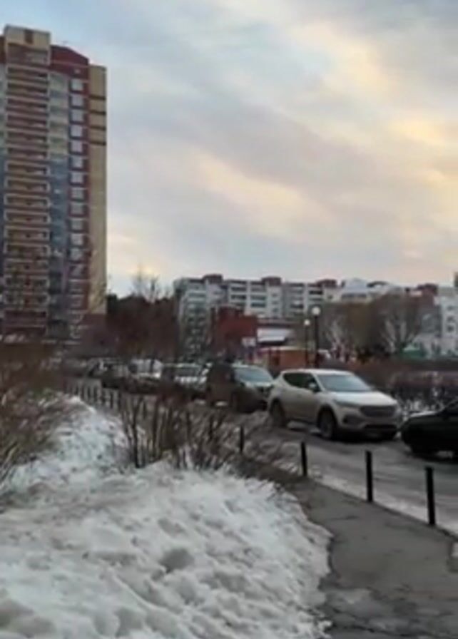 residential neighborhood scene in what appears to be a city or town with snow on the ground. The camera slowly pans to the right. Several cars are parked along the street. There's a tall apartment building visible on the left side of the frame, with other buildings and a playground in the background. The sky is cloudy with a hint of orange from the setting or rising sun. In the distance, there appear to be two people walking outside. The general atmosphere suggests a cold, possibly late afternoon or early morning, setting.