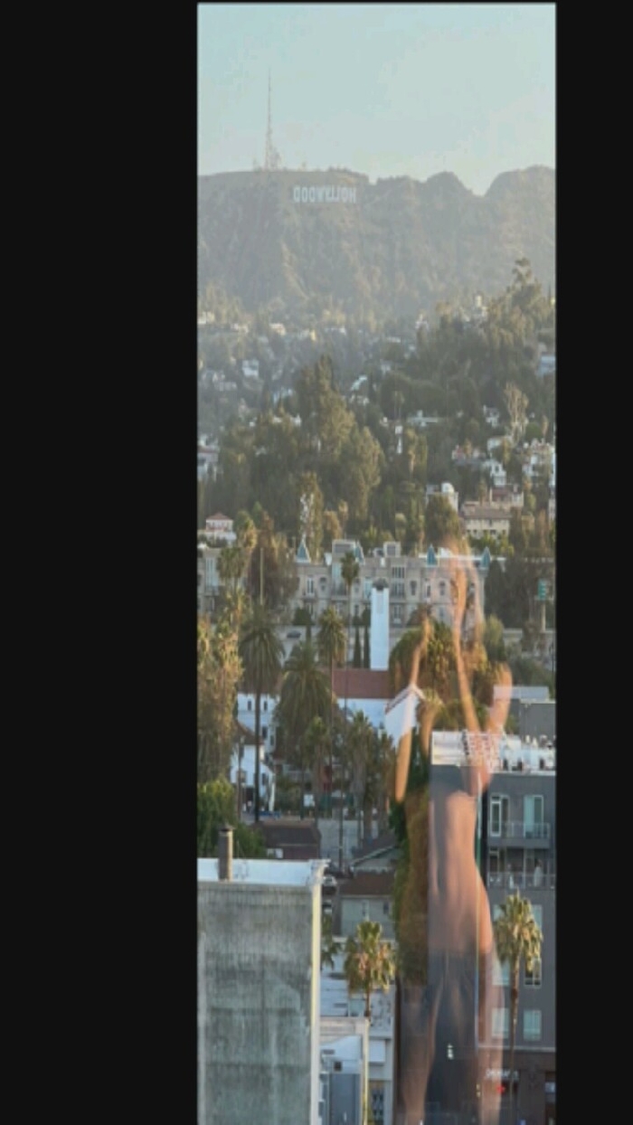 A view of the Hollywood sign sits atop a mountain, with a city and trees below. A partially transparent figure, seemingly of a woman, is overlaid or reflected in the foreground. Buildings and palm trees fill the lower portion of the image, suggesting an urban landscape. The scene is bathed in a soft, natural light, and the overall composition creates a layered effect.
