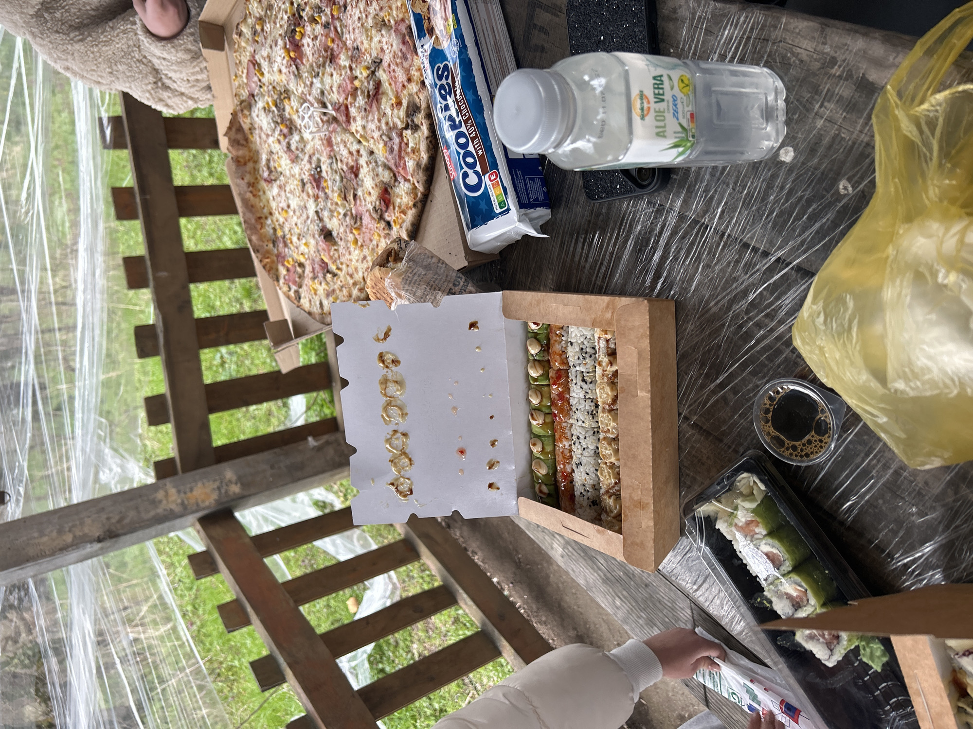 The scene depicts an outdoor meal occurring on a wooden table covered with clear plastic wrap, presumably located in the city of Shumen, Bulgaria. Two individuals are partially visible. On the left, a person wearing a light-colored long-sleeved garment has their hands near an open black plastic container holding sushi rolls, including ones with salmon and cream cheese, alongside a small portion of wasabi. On the right, another person is partially visible, wearing a light brown, textured jacket. Central to the table is a large, partially consumed pizza in an open cardboard box, featuring toppings such as ham, corn, and mushrooms, with a white plastic pizza saver present. Adjacent to the pizza box is an open brown cardboard box containing multiple rows of assorted sushi rolls; the inside of the lid shows remnants of sauce. A sealed package of "Sondey Cookies with 40% Chocolate" lies between the pizza and a clear plastic bottle of "Solevita Aloe Vera ZERO" drink. A small, clear plastic cup containing a dark liquid, likely soy sauce, is also on the table. The meal is set within a rustic wooden structure, consisting of weathered posts and railings. Clear plastic sheeting is draped around the perimeter of the structure, providing a partial enclosure. Beyond this structure, green grass and distant foliage are visible under what appears to be an overcast sky.