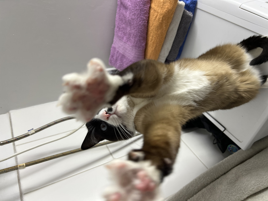 This image, captured in the city of Noviy, Russia, depicts a cat in an indoor setting, likely a utility or laundry room. The cat, with a bi-colored face featuring black fur on the left, white fur on the right, a pink nose, and a visible blue eye, stands on its hind legs. Its body exhibits a mixed fur pattern of golden-brown, white, and black, with a prominent white chest. Both of its front paws are extended forward and slightly upward towards the camera, appearing out of focus, with pink paw pads clearly visible. In the background to the right, a stack of four neatly folded towels is present, colored purple, orange, light gray, and blue from top to bottom, resting on a white, flat surface, likely a washing machine or similar appliance. The upper background consists of a white tiled wall with visible grout lines, against which two vertical pipes—one brass-toned and one silver-toned—are mounted, accompanied by associated hoses or wires. To the left of the cat, a light-colored, textured fabric hangs vertically, and a dark, indistinct object is partially visible on a lower white surface.