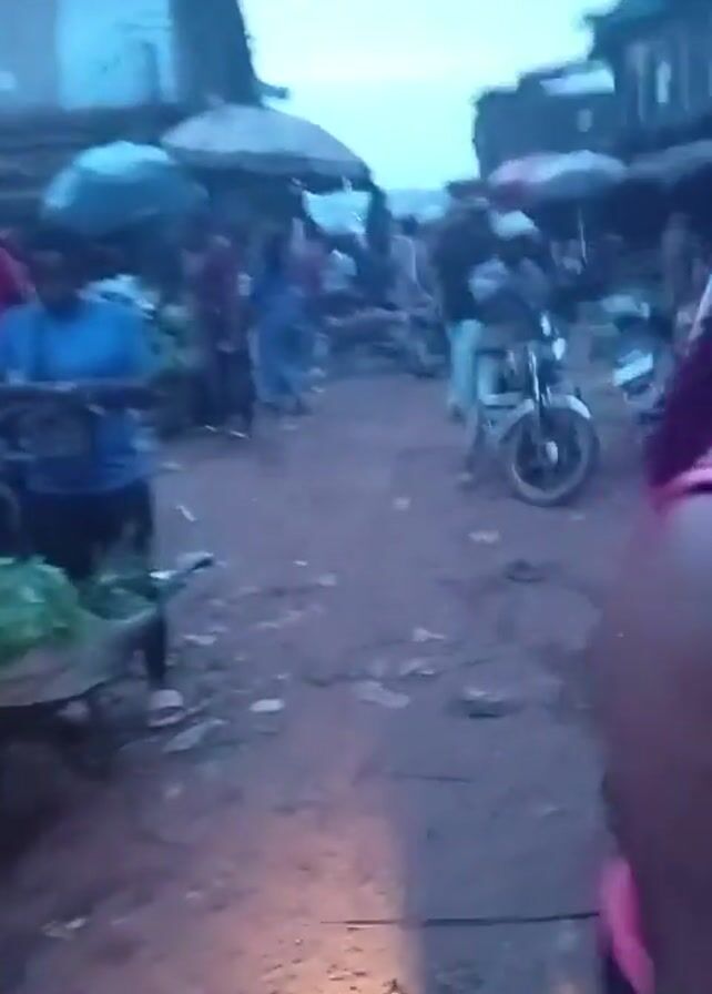 crowded marketplace, probably in a developing country. People are walking and shopping, and vendors are selling their goods. The ground is unpaved and appears to be muddy. There are umbrellas to provide shade from the sun. A motorcycle drives past. The video is shaky and somewhat blurry.