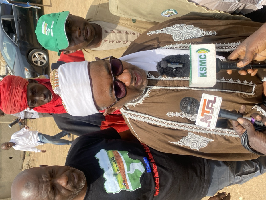 An outdoor scene in Kawo, Nigeria, depicts a group of men gathered, with a central figure addressing two microphones held by unseen individuals. The central figure, a dark-skinned male, wears a brown long-sleeved tunic with intricate white and silver embroidery, a white turban, dark sunglasses, and a white scarf draped around his neck. He is actively speaking, his mouth slightly open. To his immediate left, partially visible, is another dark-skinned male wearing a black short-sleeved t-shirt. The t-shirt features a green, yellow, and white map of Nigeria graphic with the text "ACReSAL" and "Agro-Climatic Resilience in Semi-Arid L..." beneath it. Behind the central speaker, slightly to his left, stands a dark-skinned male adorned in a red turban and matching red scarf, wearing a dark garment. To the central speaker's right, a dark-skinned male wears a light brown traditional garment and a green baseball cap displaying the text "KADUNA ACReSAL" and a graphic. Two microphones are prominent in the foreground, held by hands. One microphone features the "NTA" logo, while the other displays the "KSMC" logo on its foam windscreen. The background consists of unpaved, dusty ground. A light-colored building wall is visible to the left, and a dark-colored sedan, likely a Toyota Camry, is partially visible further back on the right, indicating a public or semi-public outdoor setting under clear daylight. Other indistinct figures are visible in the distant background.