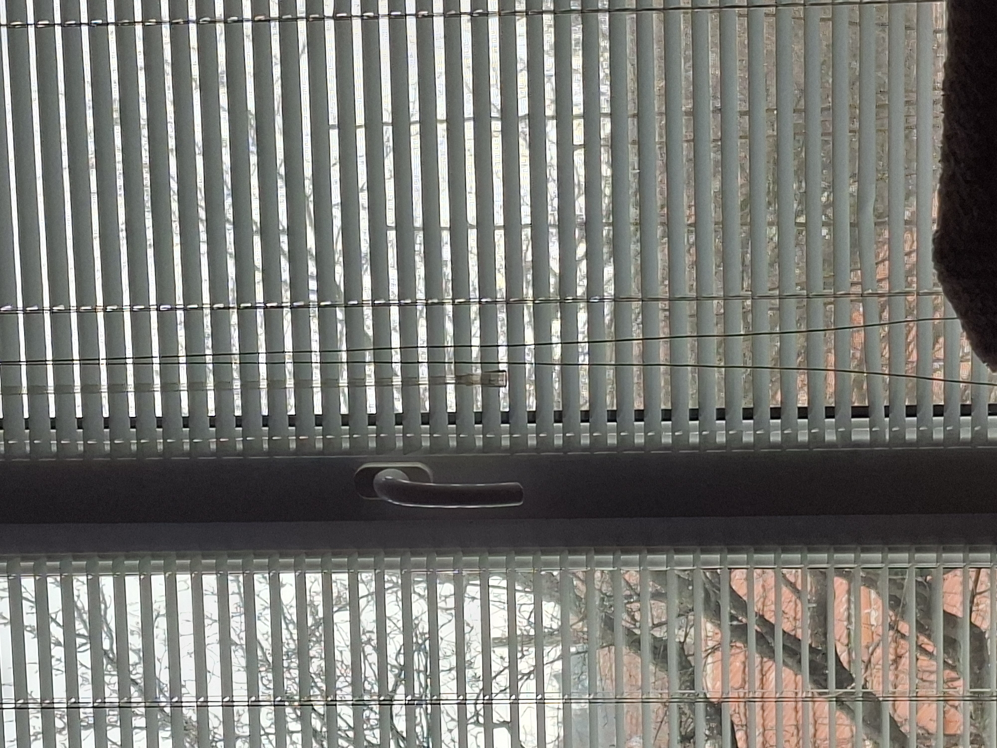 The image displays an interior perspective of a window, situated in the city of Selyanin, Bulgaria, looking outwards during daylight. The window is predominantly covered by light-colored, horizontally slatted blinds, which are mostly closed but angled to permit a view of the exterior. A dark grey vertical window frame bisects the view. A light grey, curved window handle is affixed to the right side of this frame, oriented downwards. Through the gaps in the blinds, bare tree branches are visible across the upper and central portions of the scene, indicating a cold season. Beneath the trees, fragments of orange-ttiled roofs and red brick walls from external structures are discernible. The sky appears bright and overcast. A dark, textured, and indistinct object occupies the immediate foreground at the bottom center of the frame, partially obscuring the lowest blind slats. No individuals are present in the scene.