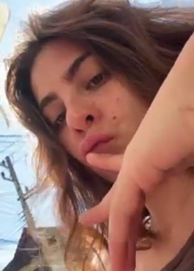 The video features a young woman with brown wavy hair and brown eyes. She is wearing a brown tank top and black shorts. Initially, she is holding her finger to her lips in what might be perceived as a playful or thoughtful gesture. Then, she runs her fingers through her hair. The camera then pans down to show her sitting on a white wrought-iron chair at a matching table on a red brick patio. Some greenery and grass are visible in the background. The setting appears to be outdoors on a sunny day.