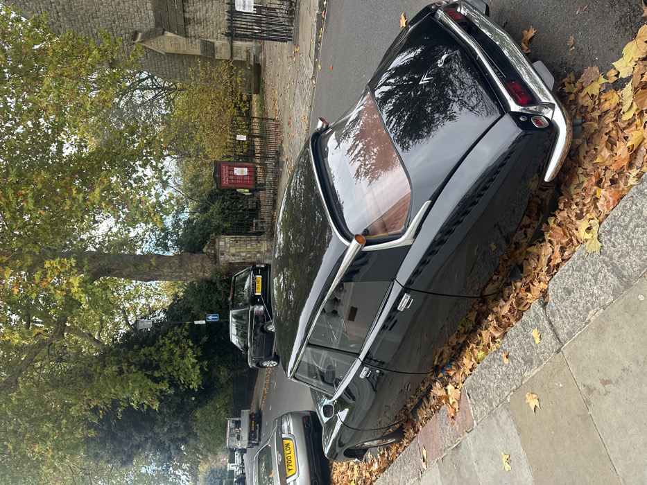 The image depicts a street scene in London, United Kingdom, specifically adjacent to St Martin-in-the-Fields. In the foreground, a highly polished black classic Citroën DS sedan is parked curb-side on the left, its lower portions partially obscured by a dense layer of fallen orange and brown autumn leaves. The vehicle exhibits chrome detailing on its bumpers, window surrounds, and roofline; a reddish-brown interior is visible through the rear window. Directly ahead of the Citroën, a silver Aston Martin, registered Y700 LON, is parked. Across the street, a black Range Rover, registered LD56 YMZ, is positioned near a stone and wrought-iron entrance gate leading to a church or churchyard. A red information board prominently displays "The Royal Church of St Martin-in-the-Fields" near this gate. One individual, wearing a yellow high-visibility vest, stands near the information board. The environment features mature deciduous trees with mixed green and yellow autumn foliage, an overcast sky, a paved sidewalk, and a cobblestone road. Other vehicles, including a light-colored flatbed truck, are visible further down the street.