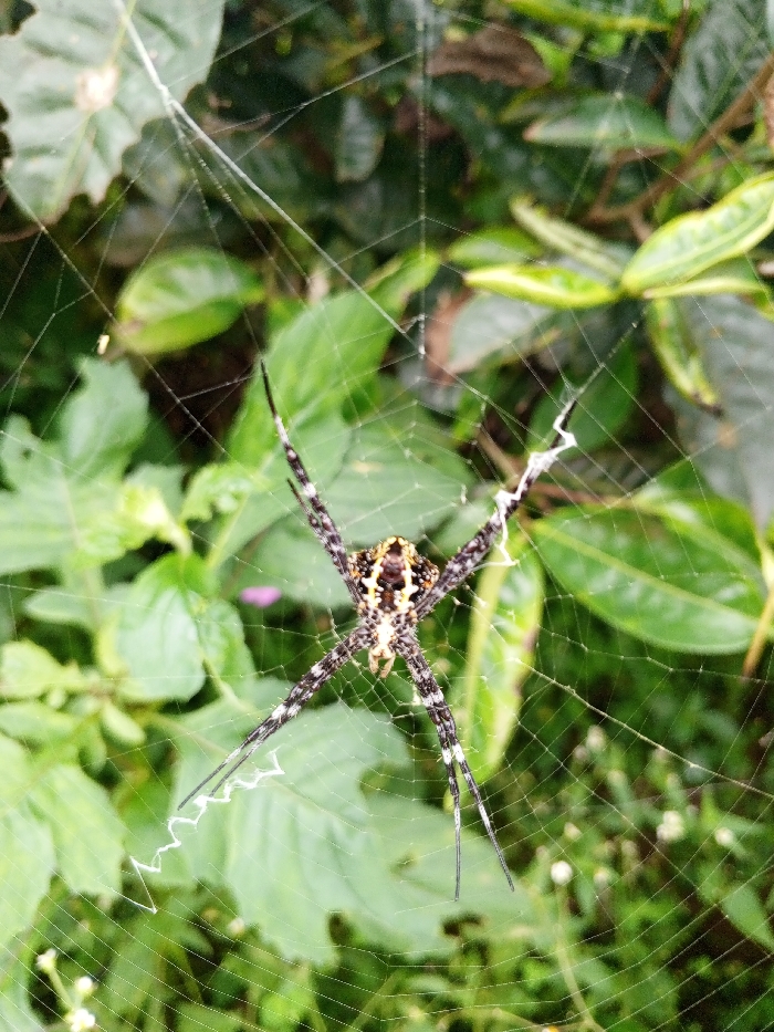 A dorsally viewed spider is centrally positioned on an orb web within a natural, vegetated environment. The spider exhibits a yellow-brown abdomen with intricate black and white markings, and its eight legs are distinctly striped in black and white, arranged in an 'X' pattern. A prominent white, zigzag stabilimentum is woven into the web, extending above and below the spider. The background consists of blurred green foliage, including leaves of various shapes and shades, some small white flora in the lower right, and a subtle purple element in the mid-left. The scene is located in the city of Unknown, Unknown.