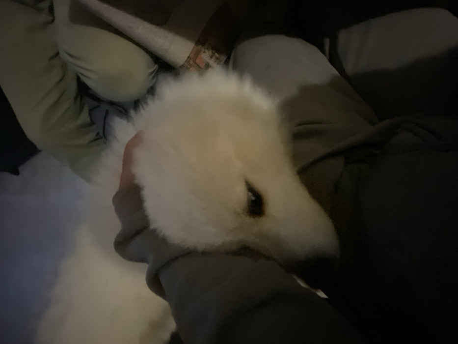 An image captured in a dimly lit indoor setting in Zgrade, Montenegro, shows a white-furred dog, likely a Samoyed, resting its head on a human's arm