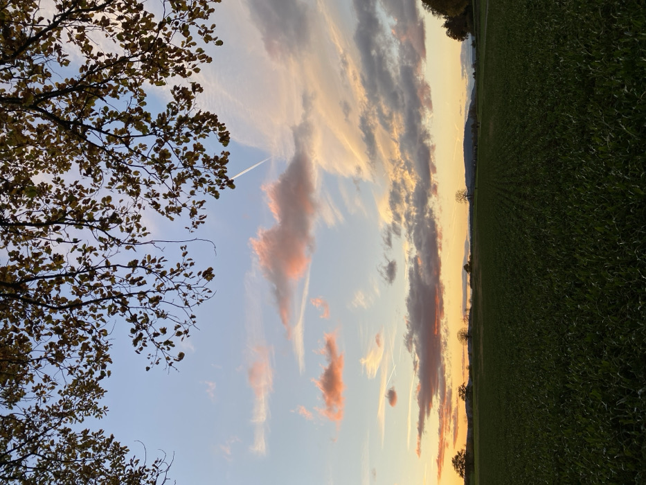 This landscape image depicts an outdoor scene at dawn or dusk in the Glattbrugg, Switzerland area. The lower half of the frame is occupied by a dark green agricultural field, showing distinct rows of low-lying crops extending towards the horizon. Along the horizon line, several bare-branched deciduous trees and a low mountain or hill range are visible as dark silhouettes against the bright sky. The upper portion of the image displays a sky that transitions from light blue overhead to warm orange and yellow hues near the horizon, particularly on the left. Scattered cloud formations are present, with several exhibiting prominent pink and orange coloration from the low sun, while others are white and gray. Two aircraft contrails are visible: a prominent white diagonal streak extends from the upper right towards the center-left, and a fainter, more horizontal streak is present in the mid-left sky. Overhead, dark, slender tree branches adorned with yellowish-brown autumnal leaves frame the top edge of the composition. No people or animals are visible.