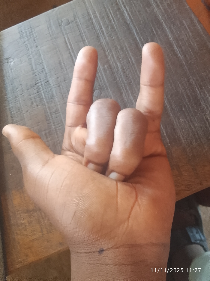 The image depicts a human hand positioned against a wooden surface. The hand, exhibiting a dark brown skin tone, is held with the palm facing towards the viewer. The index finger and the little finger (pinky) are extended vertically, while the middle and ring fingers are curled downwards and secured by the thumb. A small, dark, circular mark is visible on the lower palm or upper wrist area. The background consists of a light brown or greyish-brown wooden surface with visible grain patterns running diagonally. In the bottom right corner, a dark, indistinct object with a lighter rectangular element, possibly part of a shoe or clothing, is partially visible. A digital timestamp, "11/11/2025 11:27," is overlaid on the bottom right. The image contains no visual information to determine its specific location within Ukwu-Abwa, Nigeria, or any other geographical area.