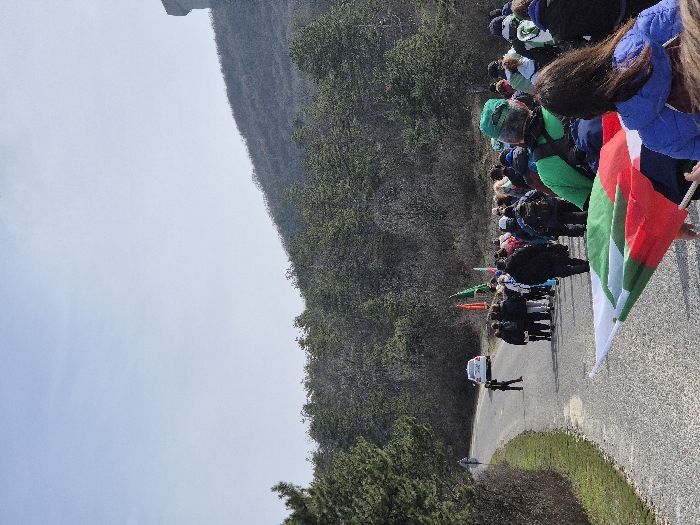 The image depicts a large group of individuals walking along a paved road through a densely forested, hilly landscape, identified as being near Chargan, Bulgaria