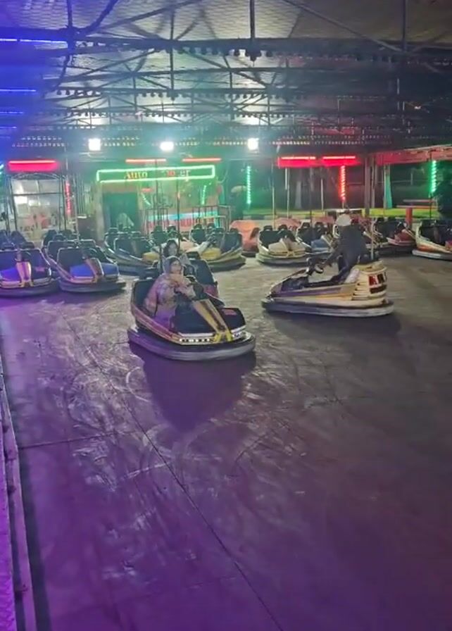 Inside a brightly lit indoor bumper car arena, several people are enjoying the ride in colorful bumper cars