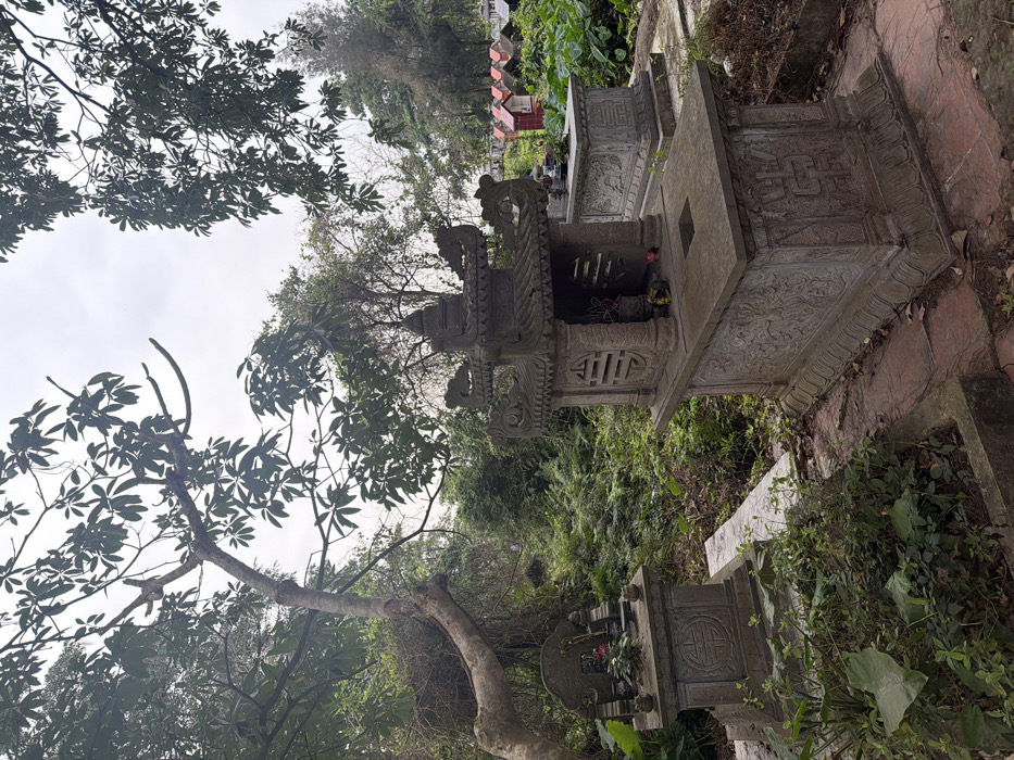 The scene depicts an outdoor view located in Hoa Lư Ward, Vietnam, presenting a section of what appears to be a cemetery or memorial ground under an overcast sky. In the immediate foreground to the right, a prominent rectangular stone structure serves as a shrine or altar. Its base is intricately carved with decorative motifs, including a central 'shou' (longevity) symbol on the front face. This base supports an ornate, multi-tiered stone shrine featuring a roof with zoomorphic figures at its corners and slatted rectangular openings on its sides. Within the shrine's central niche, offerings consisting of several small red flowers, remnants of burnt incense sticks, and small vessels are visible. A square aperture is cut into the flat surface directly in front of the niche. The shrine rests on a reddish-brown tiled or brick surface. To the left and slightly further back, a smaller, carved stone pedestal-style monument is positioned. This monument is topped with a smaller, rectangular plaque-like element, upon which fresh red flowers and green foliage are arranged as offerings. The ground around both structures is covered with diverse green vegetation, including small plants, ferns, and larger bushes. A paved or tiled pathway is partially visible between and around the structures. The background is dominated by dense, unkempt green foliage and various trees. A large tree with substantial branches and dark green leaves arches from the left foreground towards the upper center, silhouetted against the sky. In the midground to the right, a discernible row of numerous smaller, uniformly designed burial markers or shrines extends into the distance, each characterized by a reddish roof and a white base. The sky above is uniformly light grey, indicating an overcast condition. No human figures or discernible animal life are present in the scene.