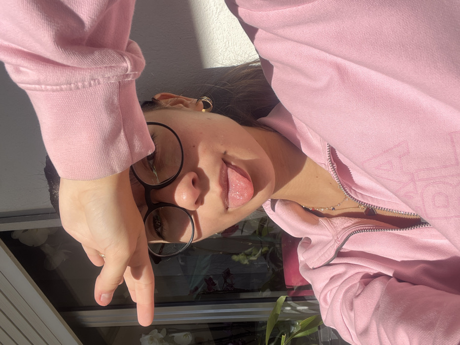 The image depicts a close-up portrait of a female individual in Vila Nova de Gaia, Portugal, under strong natural lighting. The subject is centered, looking directly at the camera. Her right hand is raised horizontally across her forehead, partially obscuring her upper face and seemingly shielding her eyes from direct sunlight. She is wearing black-framed circular eyeglasses. Her mouth is slightly open, with her tongue extended forward in a playful gesture. She wears a light pink zip-up garment with a silver zipper, which is partially unzipped. A multi-beaded necklace with small, colored beads and a small pendant is visible around her neck. Small, gold-colored hoop earrings are visible on her left ear. Her hair, dark in color, is pulled back. The background to the subject's left features a glass panel or window, through which white orchids and green foliage are visible. To her right, a plain, light-colored wall is brightly illuminated by sunlight, casting distinct shadows.