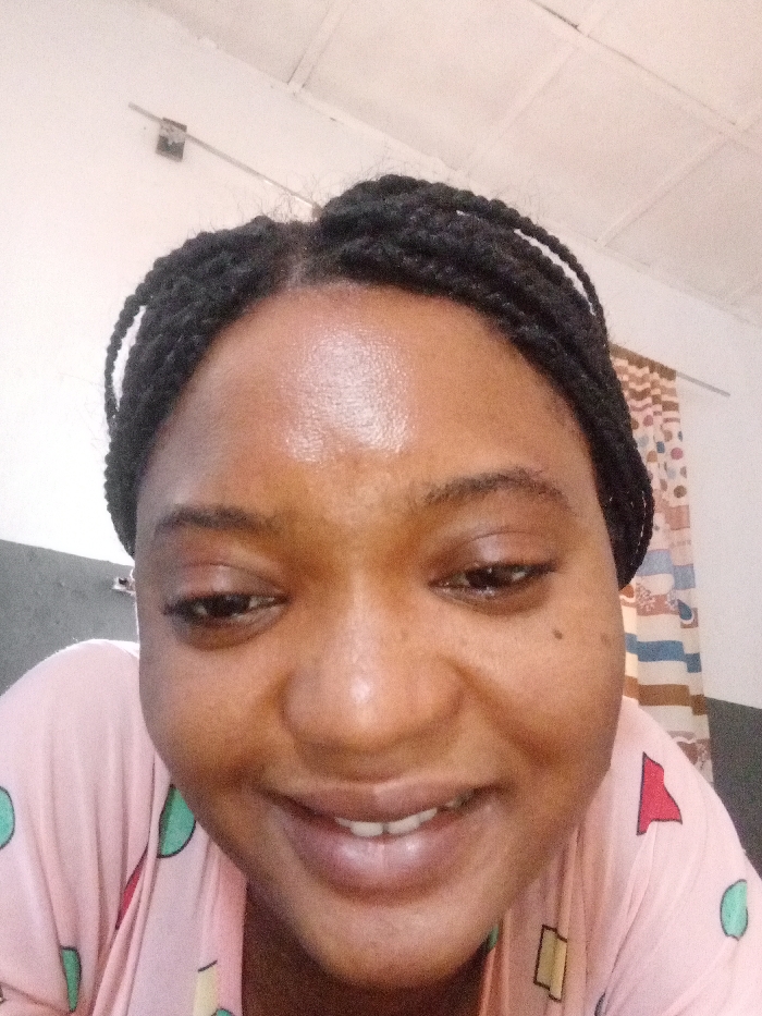 An individual, identified as female, with dark complexion and black braided hair, is depicted in a close-up, head-and-upper-torso shot
