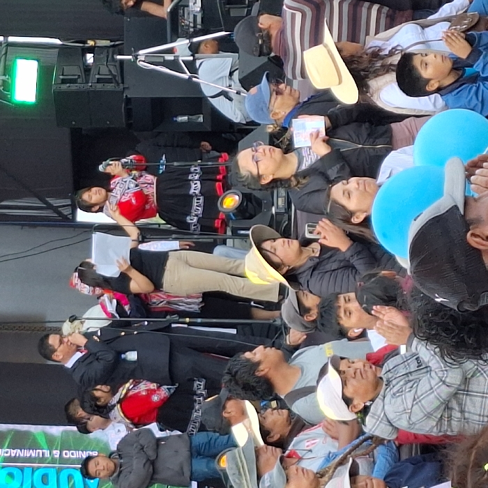 An outdoor public gathering is depicted in José Luis Bustamante y Rivero, Peru, with a stage prominently positioned in the background and a dense audience in the foreground