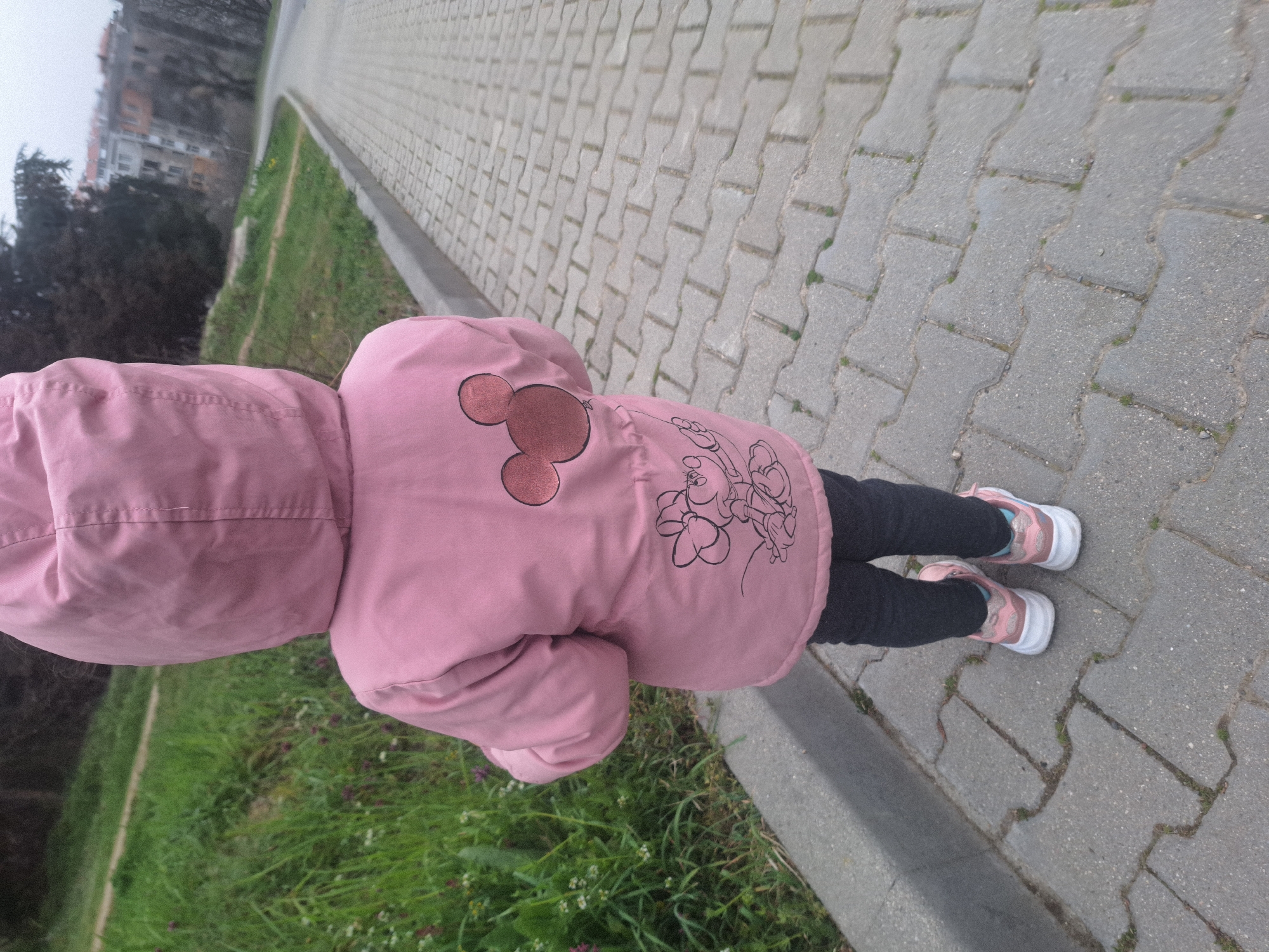 An overhead-angle image depicts a young child, seen from the rear, standing on a paved sidewalk in Stara Zagora, Bulgaria. The child wears a pink hooded jacket featuring a brown Mickey Mouse head silhouette on the upper back and a black outline drawing of Minnie Mouse on the lower back. Dark-colored trousers and pink and white athletic shoes with blue inner linings complete the attire. The child is stationary. To the left of the sidewalk is an elevated grassy area containing green grass and small wildflowers; a narrow dirt path is visible on this slope further back. To the right, the grey-paved sidewalk, composed of interlocking pavers, curves gently away into the distance. In the background, beyond the curved path and trees, multiple multi-story residential buildings are visible under an overcast sky.