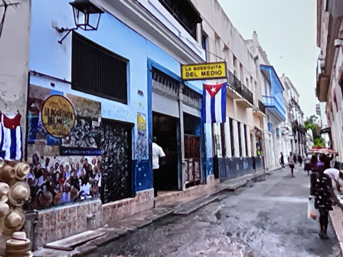 The image depicts an urban street scene in Pazardzhik, Bulgaria. In the foreground-left, a light blue two-story building features a brown base and a dark grated window above. An ornate black metal street lamp extends from the upper facade. A prominent yellow rectangular sign, "LA BODEGUITA DEL MEDIO" in red text, is affixed to the building, below which a vertical Cuban flag hangs. To the left of the main entrance, a mural-covered section of the wall displays a circular "LA BODEGUITA DEL MEDIO" logo and a mosaic of numerous human faces. Several straw hats are stacked on a display stand at ground level to the far left, and two garments resembling Cuban flags hang on the wall. The main entrance, a large dark opening, reveals a male figure in a white shirt partially visible within. The street pavement appears wet and uneven. Further down the street, on the right side, several pedestrians are visible, with one individual in the mid-ground wearing a dark patterned garment, carrying objects on their head, and holding a white bag. The street is lined with additional multi-story buildings of varying colors, including one with a bright blue balcony and dark railings in the mid-distance. The sky above appears overcast.
