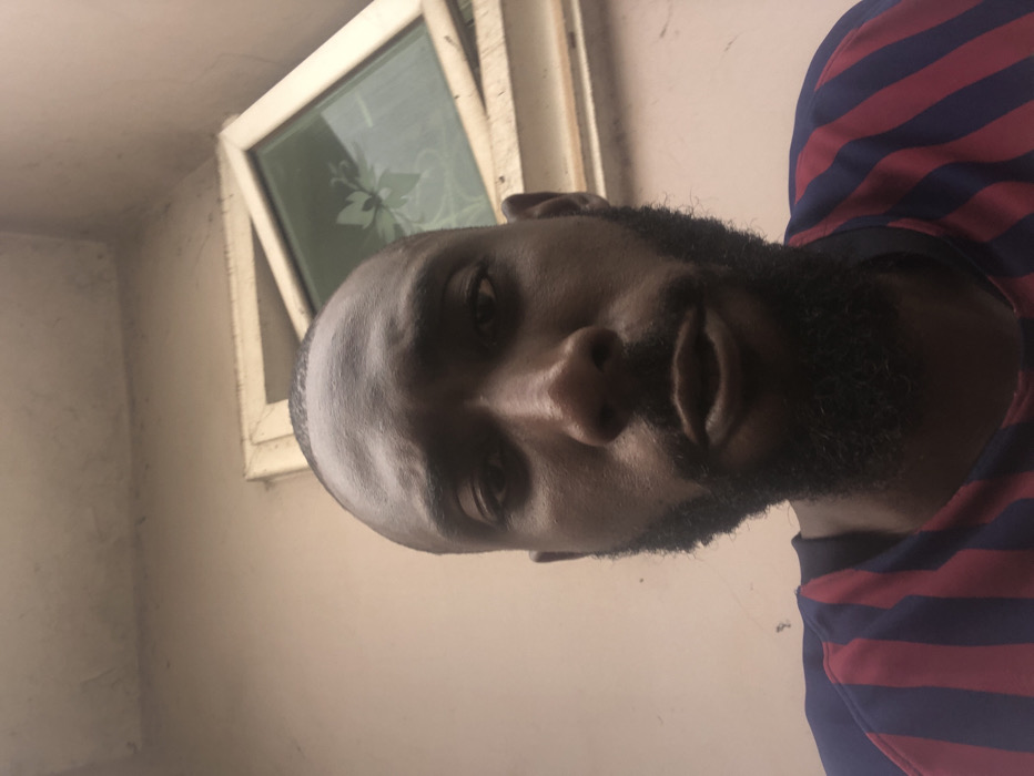A head-and-shoulders, frontal portrait of an adult Black male is depicted in Unknown, Unknown. The individual has short dark hair, a dark full beard, and a mustache, with his eyes directed towards the camera and his mouth slightly open. He is wearing a horizontally striped shirt with alternating dark blue and red bands. The background consists of a plain, light beige wall. A white-framed window, containing a dark pane with a light-colored floral pattern, is visible in the upper right quadrant of the image. The lighting is diffused.
