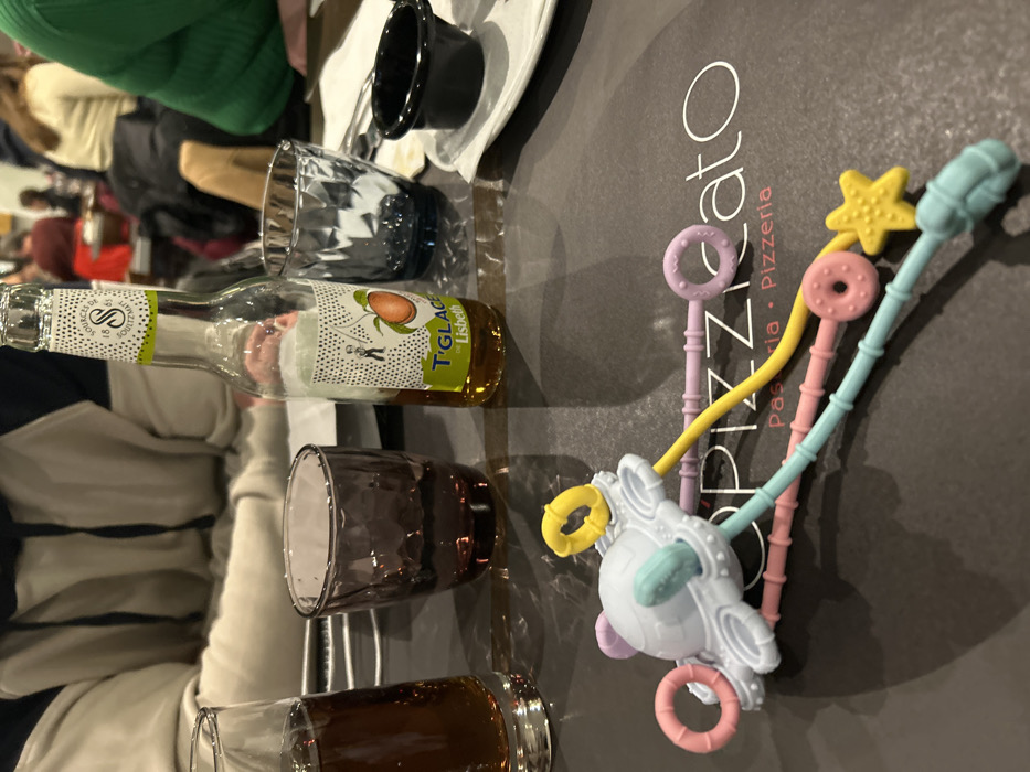 A table setting features glassware, including a transparent bottle with a light amber liquid, a black rimmed glass, a patterned glass, and a short glass filled with a dark liquid. Adjacent to the drinks is a colorful baby toy with dangling shapes attached to flexible rods. The setting appears to be in a restaurant, indicated by the background and a menu with the word "Pizzeria" visible.