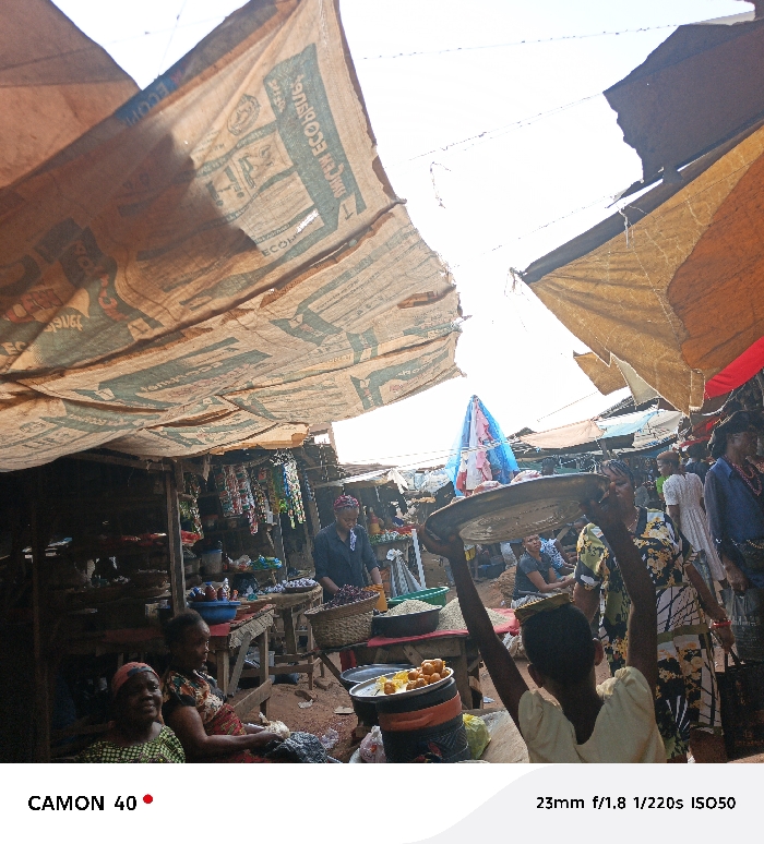 A bustling market scene unfolds beneath a canopy of makeshift tarps. People are seen browsing goods, engaging in commerce, and traversing the busy space. A young vendor carries a tray above their head, navigating the crowded market. Stalls display an array of products, from fruits and vegetables to textiles and household items. The light filters through the tarps, creating a dynamic interplay of light and shadow across the scene, underscoring the energy and vibrancy of the market.