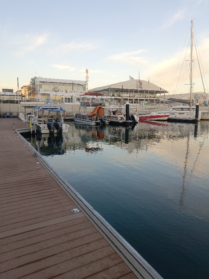 A marina scene unfolds under a soft sky. Wooden docks border calm, blue water reflecting nearby buildings and boats. Several boats, including a sailboat with its mast reaching high, are docked along the pier. A building with "al mouj marina" signage is visible, as well as another structure with a curved roof. The overall ambiance is serene and tranquil.