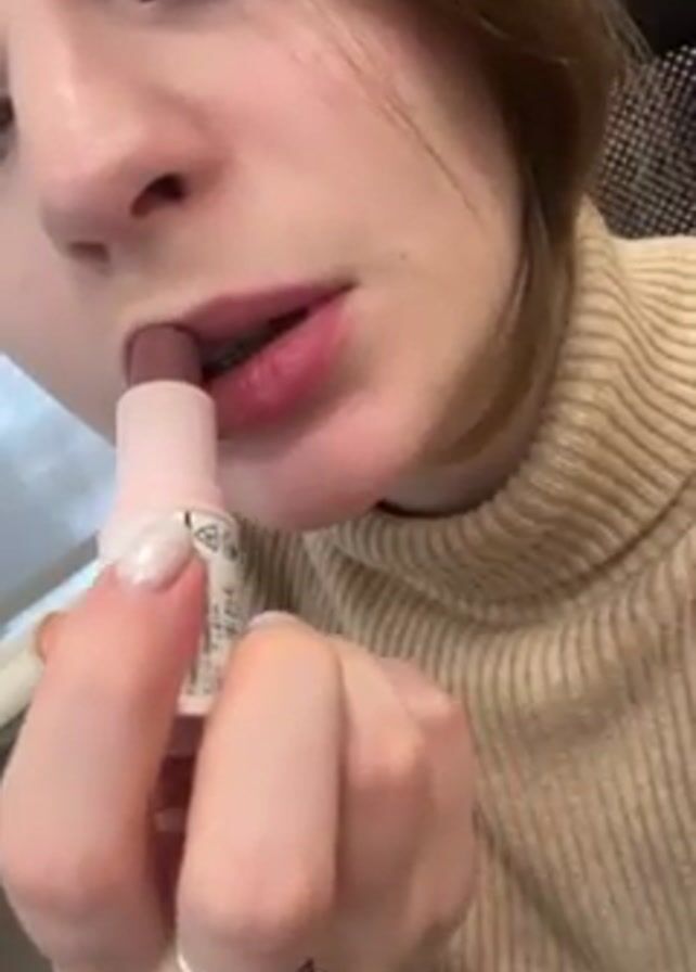 A person wearing a light brown turtleneck sweater is applying lipstick. The lipstick is in a white tube with pink accents. The person’s fingernails are painted with a white marble pattern. A silver ring is on their left ring finger. The background appears to be an office setting.