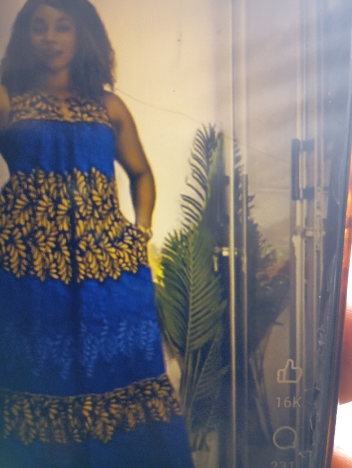 A woman in a vibrant blue and gold sleeveless dress stands near a potted palm. The dress features patterned tiers with intricate gold leaf designs. The photo is taken from a phone screen, displaying social media interaction icons, including a "thumbs up" icon showing "16K". The lighting is slightly muted, giving the image a soft glow.