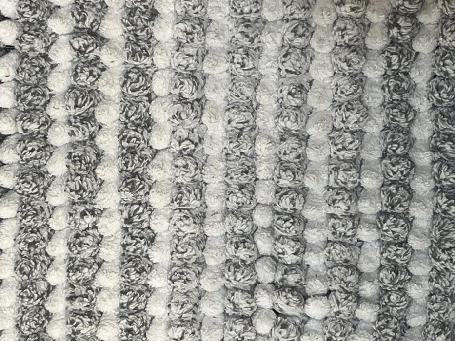 The image displays a full-frame, close-up, and overhead view of a textured textile surface. The surface is patterned with alternating horizontal rows of approximately uniform, densely packed, fibrous tufts. One set of rows consists of white tufts, while the adjacent rows are composed of dark gray tufts, exhibiting a mottled gray-and-black appearance within each spherical fiber cluster. The tufts are soft, globular, and consistently aligned in both horizontal and vertical axes, forming a repetitive grid-like structure. No people, subjects, objects beyond the textile itself, actions, or interactions are visible. The environment is entirely defined by this macro view of the textile pattern. The visual content offers no discernible information regarding a specific location within New York, United States, or any other geographical area.