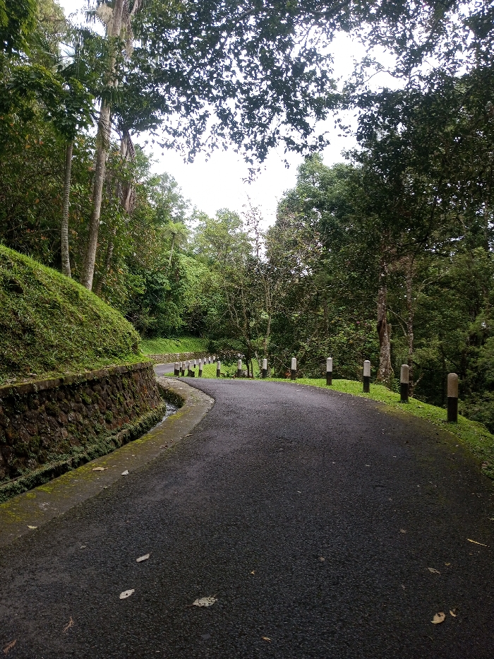 The image displays a winding asphalt road traversing a dense, verdant forest in Kanand, India. The road surface appears dark, possibly wet, with scattered dry leaves, and curves distinctly to the right, ascending gradually. To the immediate left, a concrete gutter runs alongside a low stone retaining wall, heavily covered with moss and foliage. Above the wall, a steep, grass-covered embankment rises into a thick canopy of varied trees, including several tall, slender, palm-like specimens. On the right side of the road, a narrow grass verge separates the pavement from a series of uniformly spaced, two-toned cylindrical bollards, featuring dark bases and light tops. Beyond these bollards, the terrain slopes away into a dense forest composed primarily of broadleaf trees. The sky is overcast, visible in patches through the tree canopy, suggesting diffused daylight. No people, animals, or vehicles are present in the scene.