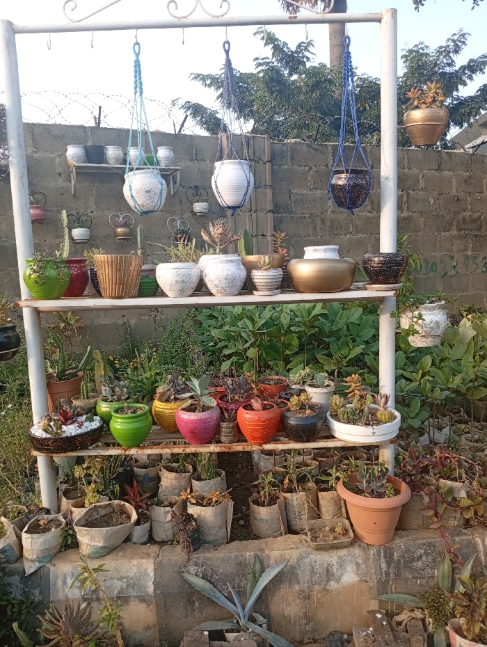 This image captures an outdoor multi-tiered plant display in Kaduna, Nigeria