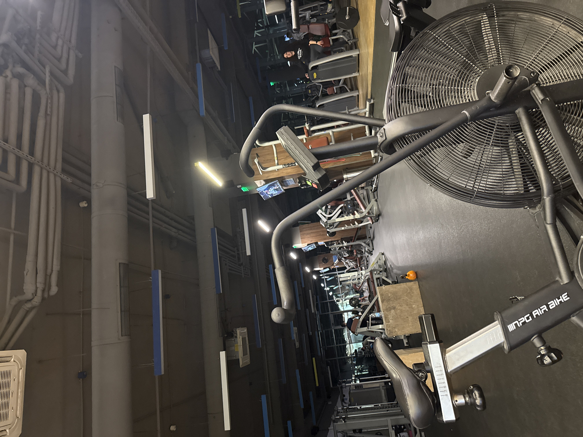 interior of a gym. A black exercise bike with a large fan is prominently displayed in the foreground. Behind the bike, there are various exercise machines arranged in rows, with a few people using them. The gym has a modern aesthetic, with industrial-style ceilings featuring exposed pipes, ducts, and a linear lighting system. The specific location within Sofia, Bulgaria, cannot be determined from the visual information provided.