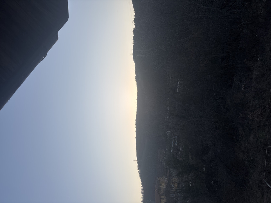 The image depicts a static, wide-angle landscape view of the area surrounding Kraino selo, Bulgaria, at either sunrise or sunset. The sky, occupying the upper portion of the frame, transitions from a pale blue at the zenith to a soft, bright yellow-white hue along the distant horizon line, indicating a low sun. The sun's light source is diffused and partially obscured by the crest of a wooded hill range, creating a backlit effect. The middle ground is dominated by a dark, undulating range of hills or mountains covered with dense, dormant deciduous trees and shrubs, rendering their branches as dark silhouettes against the brighter sky and sun glow. On the lower left slope of the terrain, several buildings are visible. The most prominent is a multi-story structure with light yellow/ochre walls and a dark red or terracotta-tiled roof, featuring visible windows. Adjacent and slightly behind it are additional, less distinct residential-style buildings. A slender, dark power line pylon is discernible on the ridge of a hill towards the left. The immediate foreground and lower midground are filled with a dense mass of dark, bare tree branches and sparse, dark ground cover, suggesting a winter or early spring season. No individuals are present in the scene. The upper right corner of the image shows a dark, angled architectural overhang, possibly a roof eave or awning, with a small, dark, curved object attached to its underside, suggesting the photograph was taken from beneath a structure.