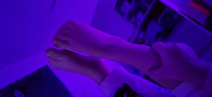 An extreme close-up of two bare feet bathed in intense purple light. One hand grips an ankle. The background is blurred, suggesting a room with shelves or storage containers. The lighting obscures details, but the hand and feet appear human. The image evokes a feeling of surrealism and intimacy due to the color and the unusual perspective.
