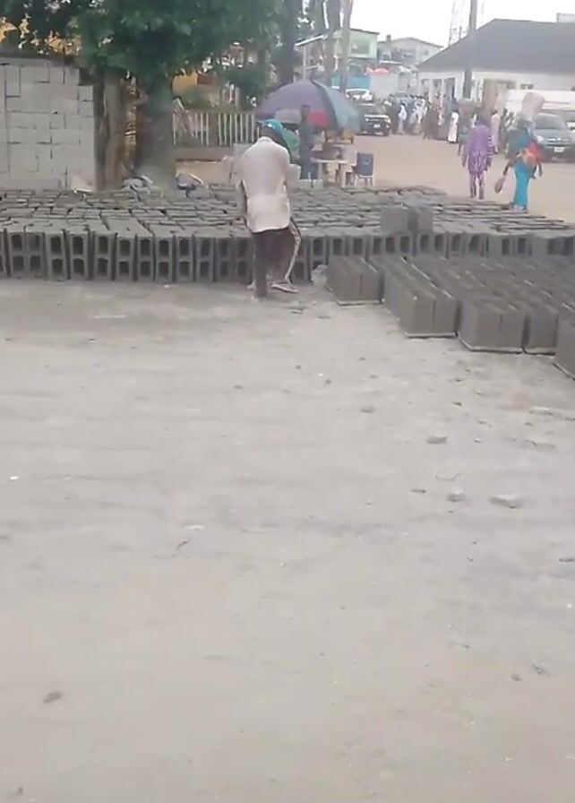 scene at a block industry or building material sales location. Multiple stacks of gray concrete blocks sit on a sandy or dirt surface, arranged in rows. Two men wearing hats are working near the blocks, possibly moving or arranging them. People are walking in the background, past a line of shops and stands covered with tarps or umbrellas. Buildings and trees are visible in the background, indicating the location is likely a commercial or residential area.