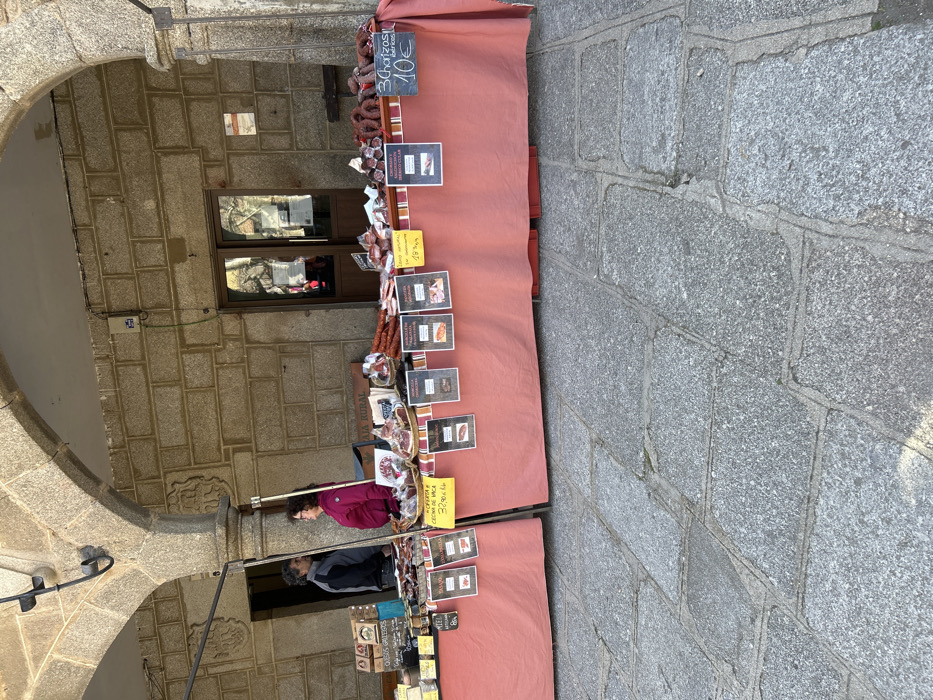 A market scene is depicted in Piedrahíta, Spain, set under a stone portico featuring two rough-hewn granite arches and pillars. The background reveals a building wall constructed from similar granite blocks, with a brown double-door entrance reflecting trees. A white electrical box is mounted left of the door. The foreground consists of an irregular grey stone slab pavement. Two market stalls, covered with reddish-orange fabric, are laden with products. The left stall displays cheeses, jars, and packaged goods, with a visible sign for "QUESOS GALLEGOS." The right stall features a variety of cured meats, including numerous dark red sausages and packaged hams. Prominent yellow and white signs indicate prices and product names in Spanish, such as "OFERTA ½ CECINA DE VACA 32,90€ Kg" and "3 Chorizos Ibéricos 10€." Behind the stalls, a male with grey hair in a dark grey and black jacket faces right, while a female with dark curly hair in a pink top faces left. Both individuals appear to be conversing, positioned to attend the market stalls. Natural sunlight illuminates the scene, casting shadows on the ground.