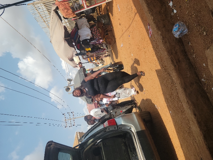 This image depicts a bustling outdoor scene in a street market area in Asaba, Nigeria, under a bright, cloudy sky. In the foreground, a dark-skinned female, estimated to be in her 20s or 30s, walks diagonally from the center-left towards the mid-right. She wears a form-fitting black short-sleeved top and black leggings, with dark sandals on her feet. A black handbag is carried on her left arm. Her gaze is directed slightly upwards and to the right. To the left, a silver vehicle, likely a minivan or SUV, is parked with its rear hatch open, revealing the cargo area. A male individual in a light-colored t-shirt and dark trousers stands near the vehicle. Several other indistinct figures are partially visible in the mid-ground. On the right side of the image, two market stalls are set up under large, light-colored umbrellas, displaying various items such as clothing and bags. A utility pole with a mounted loudspeaker is visible behind the main subject, and multiple electrical wires crisscross the upper sky. The ground consists of reddish-brown unpaved dirt. A shallow, open drainage trench or gutter runs along the bottom foreground, containing a discarded clear plastic bag with blue contents. Strong shadows are cast on the ground, indicating direct sunlight.