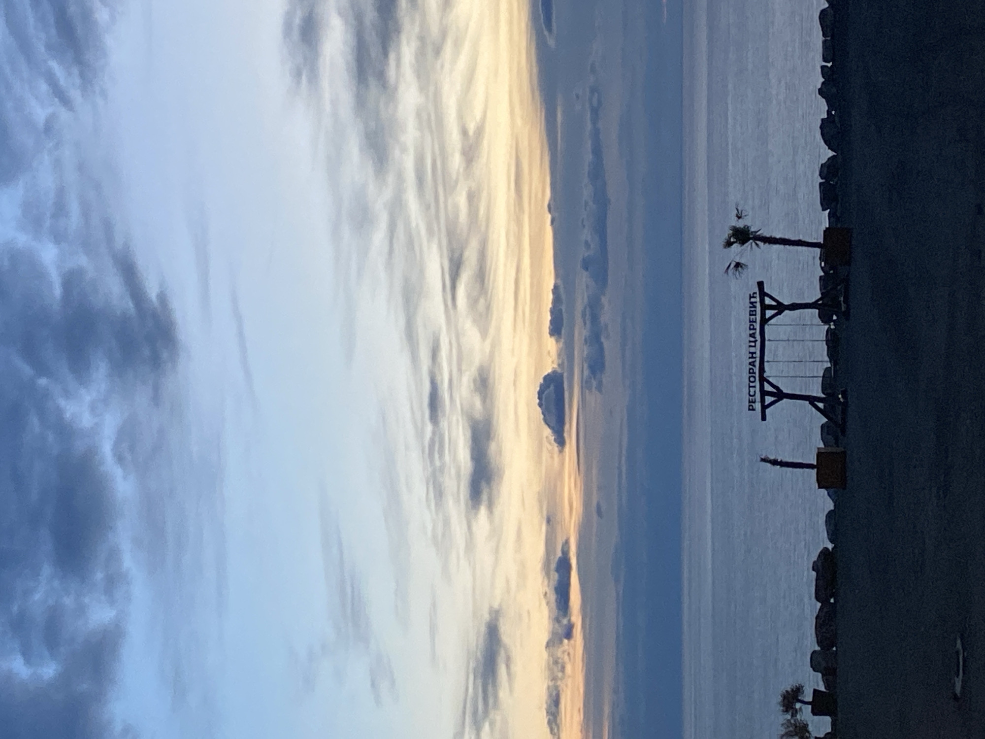 view of the sky and sea in Kovačko Polje, Montenegro. The sky is filled with clouds, ranging in color from dark grey to light blue and yellow. The sea is a calm expanse of grey-blue water. A sign for "Ресторан Царевић" (Restaurant Carevic) stands on the shore, next to a palm tree. The shoreline is lined with rocks.