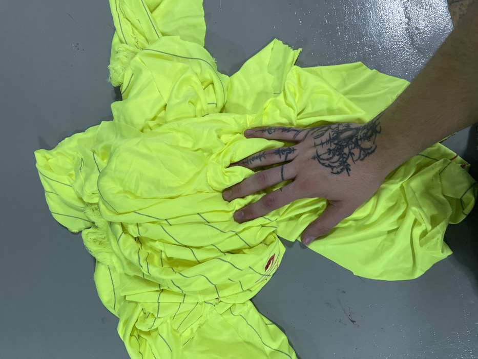 A person's hand with tattoo touches a crumpled yellow fabric with gray stripes on a gray surface
