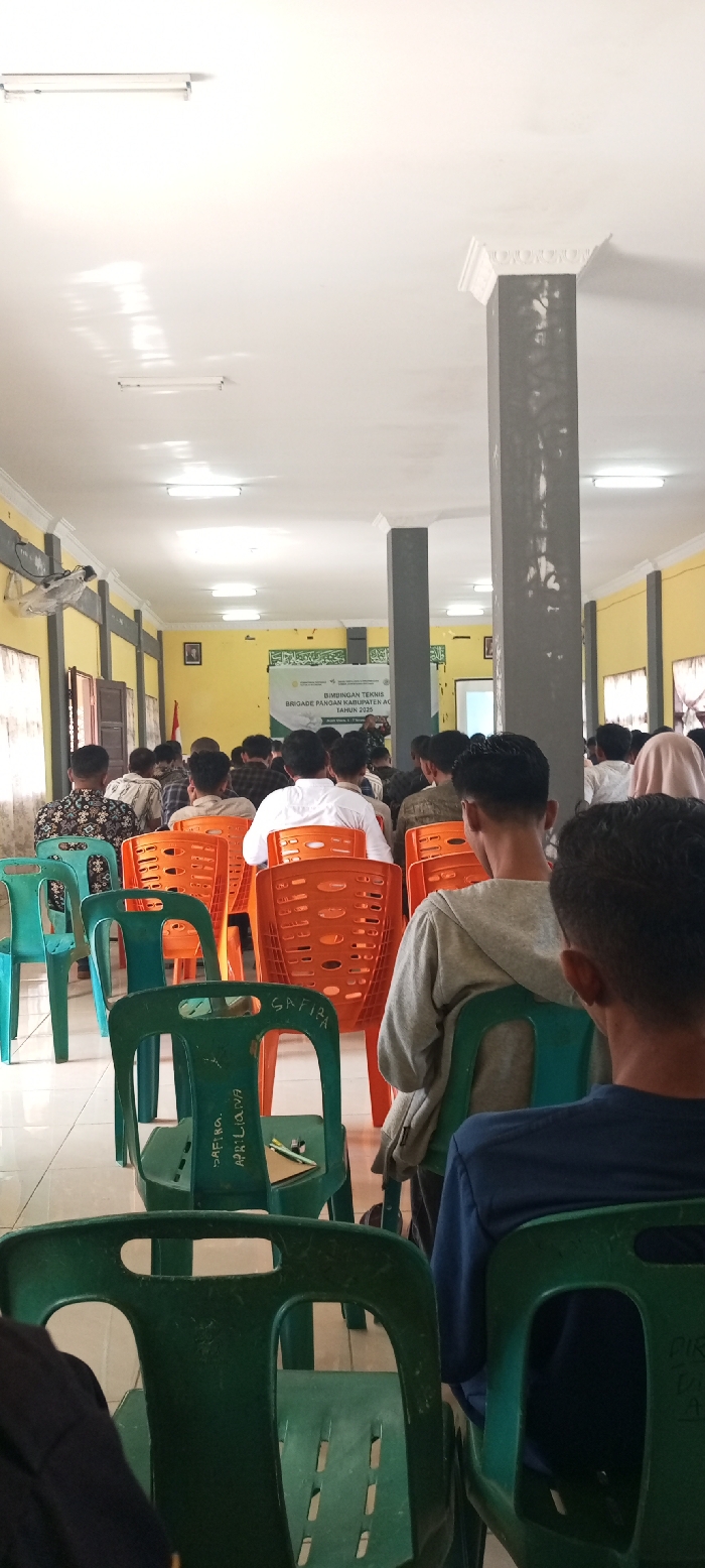 An indoor gathering of people is seated in rows of green and orange plastic chairs. A speaker is at the front of the room, partially obscured by attendees. A banner hangs on the yellow wall behind the speaker, possibly indicating the event's purpose. The room is brightly lit, with multiple fluorescent lights on the white ceiling. Support columns, painted grey, are visible throughout the space. The floor is tiled.