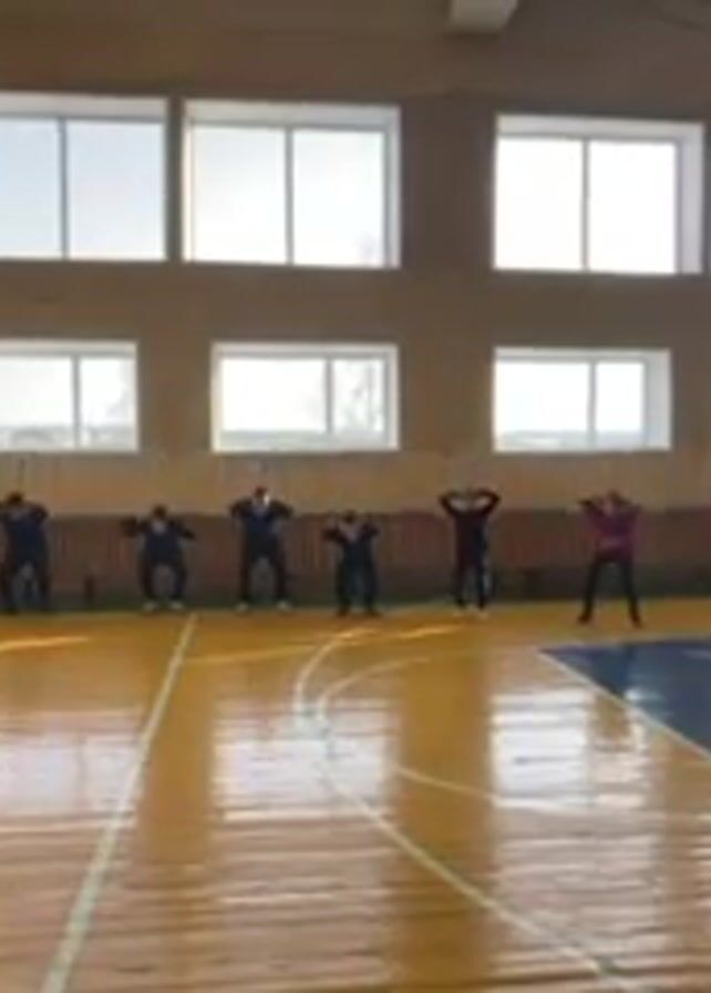 group of individuals in a gymnasium. There are eight individuals visible, standing in a line on a wooden basketball court. They are performing squats with their hands behind their heads. The gymnasium is well-lit by sunlight streaming through a row of windows along one wall. On the opposite wall, a climbing wall is visible. The floor is marked with blue and green lines. The people are wearing athletic clothing.