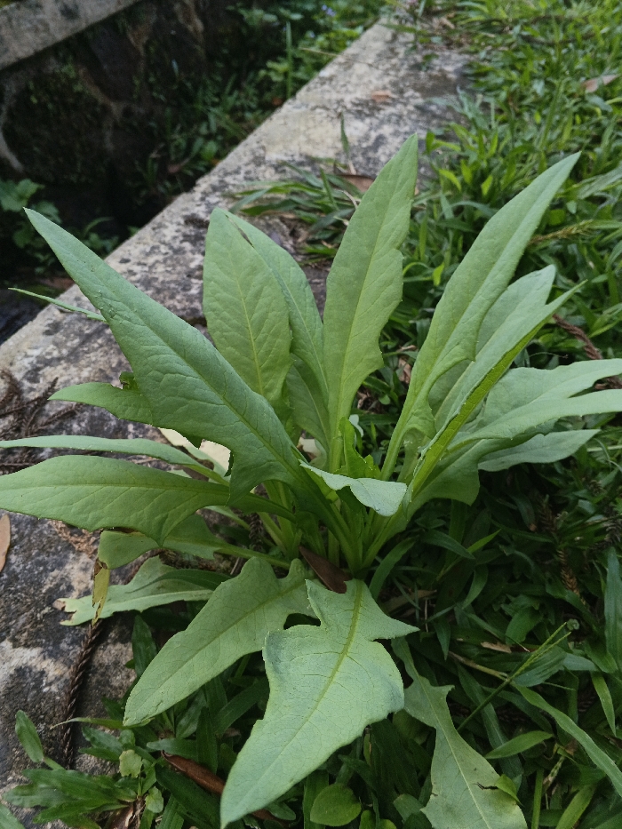 The image displays a close-up view of a green leafy plant in Stueng Saen, Cambodia. The primary subject is a plant with numerous light to medium green leaves, exhibiting visible venation and slightly irregular or lobed margins, emanating from a central point. This plant is situated at the edge of a weathered concrete structure, likely a curb or channel, which extends diagonally from the lower left to the upper right quadrant. Beyond the concrete structure, a dark, recessed area consistent with a ditch or drain is visible, partially obscured by additional green vegetation. To the right and in the immediate foreground, the ground is covered by dense green grass and smaller plants, interspersed with scattered brown organic debris. No individuals, animals, or other man-made objects are present. The scene is illuminated by natural, diffuse light.