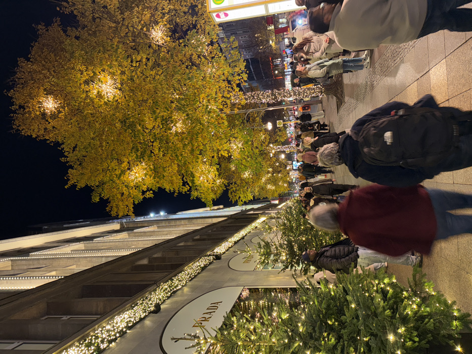 The image depicts a nighttime street scene on Kurfürstendamm in Berlin, Germany, adorned with early winter holiday decorations. On the left, a multi-story building housing a "PRADA" store is illuminated with vertical and horizontal white string lights, with its facade partially visible. The sidewalk directly in front of this building is lined with several evergreen Christmas trees, each decorated with white string lights. To the right, mature deciduous trees, exhibiting golden-yellow autumn foliage, are festooned with spherical, starburst-shaped white light fixtures and have their trunks wrapped with string lights. A dense crowd of pedestrians, dressed in various winter garments including jackets and coats, occupies the bustling sidewalk, walking in both directions. In the immediate foreground, two individuals are seen from behind, walking away from the camera; one wears a dark red jacket and blue jeans, the other a dark jacket and a black backpack with a visible "The North Face" logo. A man in a black puffer jacket and a blue baseball cap stands near the Christmas trees on the left midground. In the background, across the street, additional illuminated commercial buildings, streetlights, and blurred vehicle lights are visible, along with a yellow U-Bahn station sign on the right.