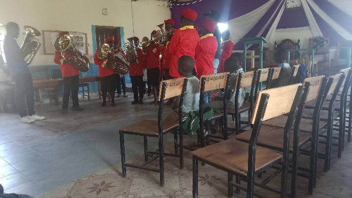 A brass band is performing in a room with rows of chairs. The musicians wear red jackets and hats, playing tubas and trumpets. In the foreground, children sit in the chairs, looking toward the band. A purple and white draped fabric is visible in the background. The room appears to be a church or community hall, with simple wooden furniture and tiled floors.