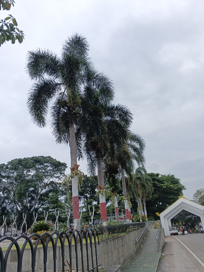 The scene depicts an urban public park or promenade area in Ho Chi Minh City, Vietnam, under a uniformly overcast sky. A line of five tall, mature palm trees, consistent with Foxtail Palms, stands prominently in the mid-ground, displaying dense green fronds and visible fruit clusters. The lower trunks of these palms are painted white with a distinct red horizontal band, and several epiphytic ferns are observed clinging to their surfaces. In the immediate foreground, a black, arched metal fence extends across the lower portion of the frame. To the right of the fence, a paved pedestrian ramp, featuring a central green strip, slopes gently downwards. Beyond the fence and behind the palm trees, a landscaped garden area contains various smaller plants and multiple white, abstract, X-shaped sculptures. To the far right, a distinctive white arched gateway with a pointed roof and golden finials marks an entrance point. Beneath this archway, several motorbikes and a white light utility truck are parked. Multiple human figures are present near these parked vehicles; their specific actions or interactions are indistinct due to distance and resolution. The overall environment is one of an organized urban green space.