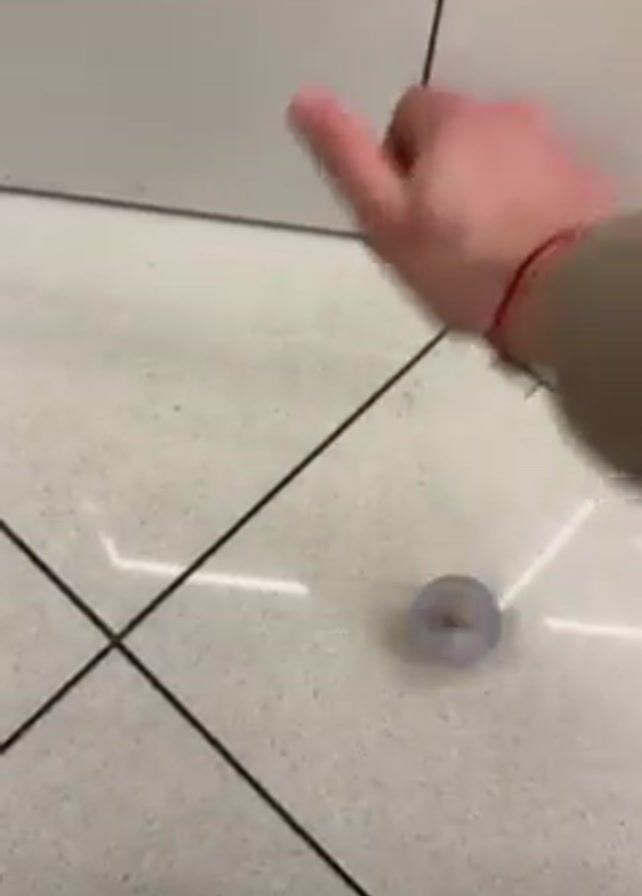 A hand sets a clear plastic top with a wooden dowel in the center spinning on a white tiled floor with black grout. The hand touches the top, briefly stopping it from spinning. There are white walls in the background. A red and white bracelet is visible on the wrist.